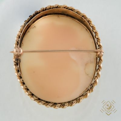 An elegant cameo set made in sea shell (Conchifera) from the mid-20th century. The setting designed as a braided gold cord. Brooch with the image of the Roman goddess. The earrings, on the other hand, depict three graces. The cameo is a kind of gemma with a convex relief, which was used to make precious stones, most often two-colored and also beads or sea shells.