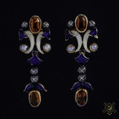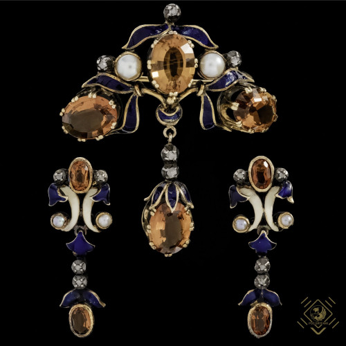 Wyjątkowo urokliwy komplet biżuterii składający się z kolczyków i broszy wykonany w pierwszej połowie XX wieku. Sercem klejnotów są centralnie umieszczone cytryny w dyskretnym towarzystwie niewielkich perełek oraz rozet diamentowych. Całość okraszona kropelką błękinto-białej emalii.