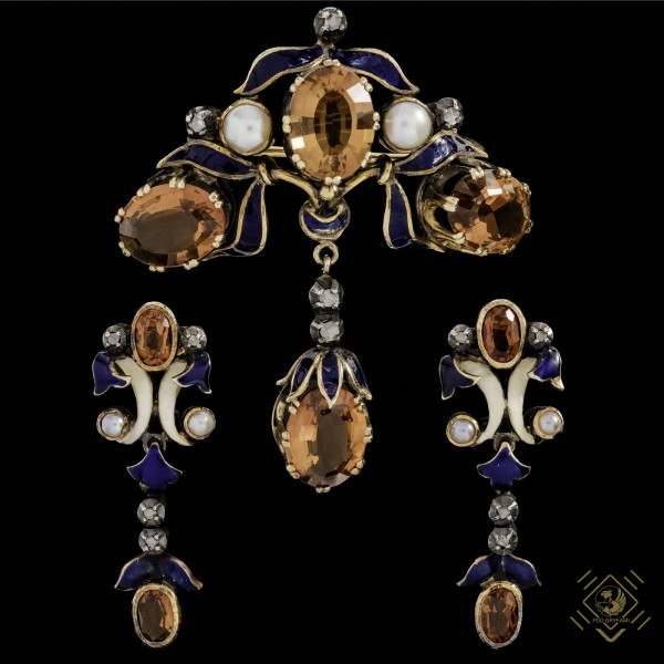 An exceptionally charming jewellery set consisting of earrings, as well as a brooch made in the first half of the 20th century. The heart of the gems are centrally placed Citrines, discreetly accompanied by small pearls and diamond rosettes. This is all additionally decorated with a drop of blue and white enamel.