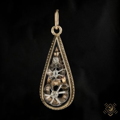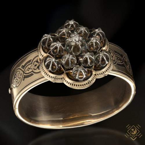 Unikatowy komplet biżuterii składający się z okazałej bransolety z ukrytym sekretnikiem, broszy, kolczyków i wisiora. Całość wykonana w złocie ozdobiona diamentami w starych szlifach old square cushion cut, old mine cut oraz rozet. Kamienie oprawione w srebro. Ornamentyka floralna tworząca w konstrukcji niewielkie ażurowe kwiaty. Dodatkowo bransoleta dekorowana niellem. Majstersztyk ręcznej pracy złotniczej opatrzonej polskimi puncami lombardowymi bitymi do 1950 roku.
