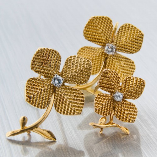 Niezwykle wdzięczny, urokliwy a zarazem bardzo kobiecy komplet, na który składa się wisiorek oraz dwie zapinki. Konstrukcja wykonana ze złota w formie czterolistnej koniczyny. Środek każdego kwiatka ozdobiony niewielkim diamentem. Smaczku całości dodaje sygnatura Pierre Sterlé.
