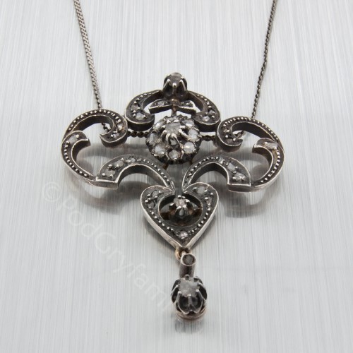 Wisior wykonany w stylu secesyjnym ze srebra łączonego ze złotem. Fantazyjny wzór ozdobiony rozetami diamentowymi pięknie prezentuje się na dekolcie.