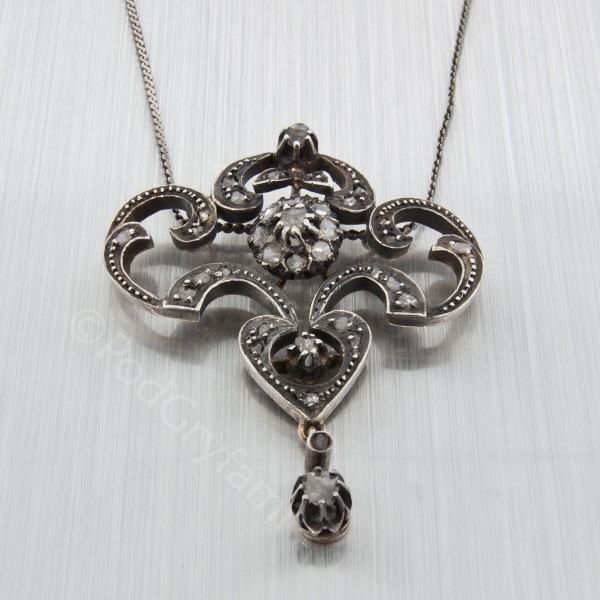 Art Nouveau pendant necklace made of silver combined with gold. Fancy pattern decorated with diamond rosettes, looks beautiful on the neckline.