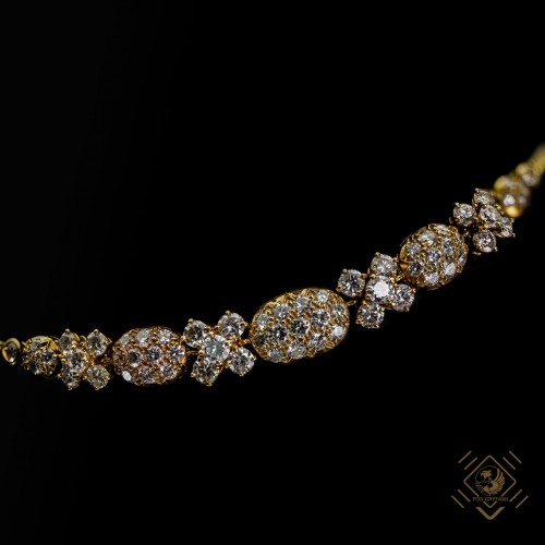 delikatny wykonany z 18 karatowego złota łańcuszek ozdobiony ułożonymi naprzemiennie owalnymi i krzyżykowymi elementami wysadzanymi niewielkimi okrągłymi diamentami. Połyskujący lśniącymi diamentami klejnot to wysokiej jakości wyrób znanej na całym świecie maki jubilerskiej Cartier.