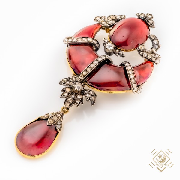 A rare historical specimen with an unusual combination of garnets, diamonds and diamond rosettes in a beautifully chiseled setting with plant motifs. A masterpiece emphasizing the artistry of 19th century goldsmiths.