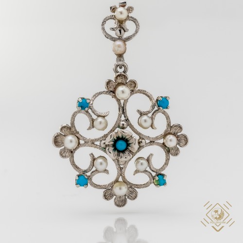 Uroczy, bardzo kobiecy drobiazg. Piękna fantazyjna forma z kwiatowym akcentem wykonana z białego złota, ozdobiona niewielkimi perełkami i turkusami.