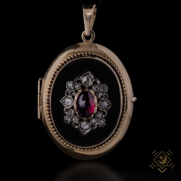 An exemplary piece of sentimental jewelry from the late 19th and early 20th century. Beautiful composition and excellent combination of stones. Rosette cut diamonds surround an unusual purple-red color almandine in cabochon cut on a contrasting onyx set in 18 carat gold. This piece has soul and elegance appropriate to the era and, like this locket, it's shrouded in mystery.
