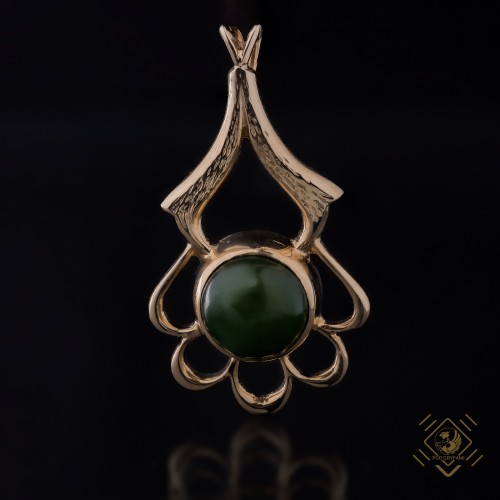 Fantazyjny kształt wykonany w złocie przypominający kwiat, którego środek wypełnia malachitowy kaboszon. Malachit znany już od starożytności, bardzo ceniony w jubilerstwie z powodu przepięknej barwy i właściwości chemicznych oraz fizycznych.
