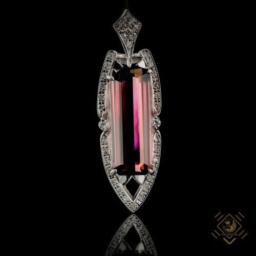 Przepiękny turmalin o niezwykłej purpurowo różowej barwie ujęty w platynowej oprawie ozdobionej delikatnymi diamentami. Nieregularny szlif kamienia podkreślony nietypową kompozycją konstrukcji. Turmalin należy do minerałów rzadkich a nawet bardzo rzadkich, przypisuje mu się właściwości lecznicze oraz magiczne.