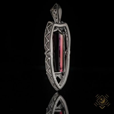 This pendant includes a beautiful tourmaline with a unique purple pink color framed in platinum with delicate diamonds. The irregular cut of the stone highlights the unusual composition of the design. Tourmaline is a rare minerals, even very rare, and it has healing and magical properties attributed to it.