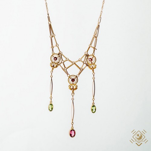 Delikatny secesyjny wzór, ozdobiony turmalinami i oliwinami niczym pajęczynka otuli kobiecy dekolt. Pełen wdzięku i fantazji sprosta najbardziej wyszukanym gustom.