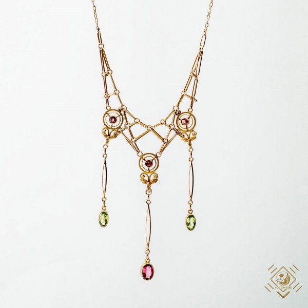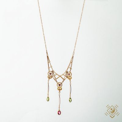Delicate art deco design, decorated with tourmalines and olivines. The piece is almost like a spider web on a women's neck. This is a unique piece full of life and imagination for people with great taste.