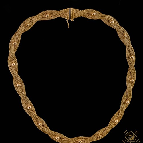 Niezwykle miękko układający się na dekolcie naszyjnik wykonany z dwóch splecionych ze sobą części ozdobionych złotymi kulkami.