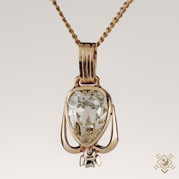 A large pear-cut diamond in a delicate yellowish color, set in a simple setting.