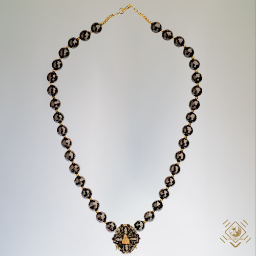 Wspaniały sznur okazałych almandynów w postaci fasetowanych kul. Centralne miejsce naszyjnika zdobi medalion kameryzowany granatami oraz rozetami diamentowymi z umieszczonym pośrodku niewielkim złotym owadem.