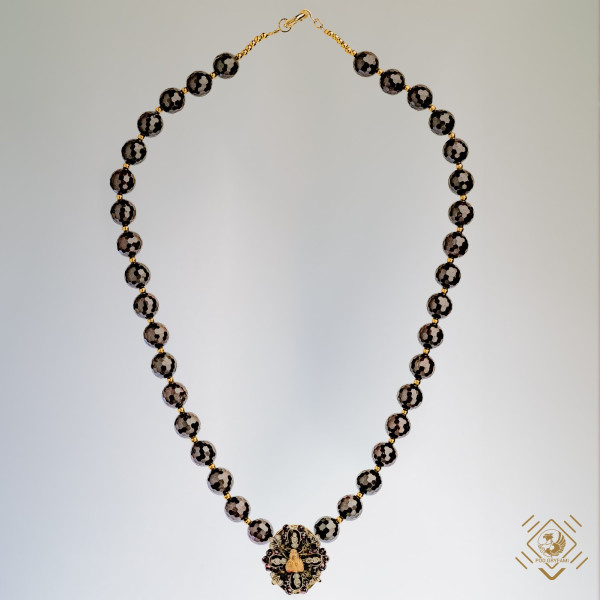 A wonderful string of magnificent almandines in the form of faceted balls. The central part of the necklace is decorated with a medallion made of garnet and diamond rosettes, with a small golden insect in the middle.