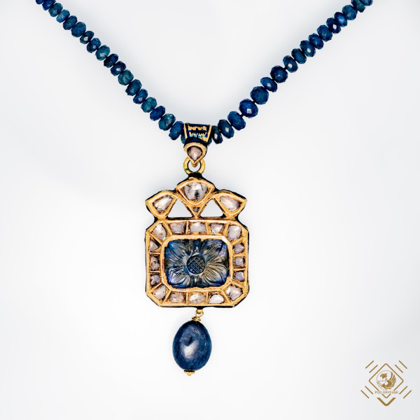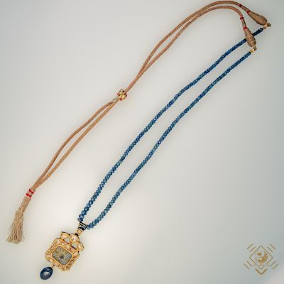 An unusual oriental necklace whose clou is a double-sided pendant made of gold. The pendant is decorated with engraved quartz and diamond rosettes on one side, and beautiful cobalt enamel on the other.