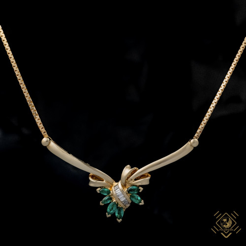 Uroczy drobiazg o fantazyjnym kształcie, wykonany w złocie ozdobiony diamentami w szlifach bagiet oraz szmaragdowymi markizami. Szmaragdy w głębokiej ciemnozielonej barwie doskonale korespondują z ciepłym odcieniem złota.