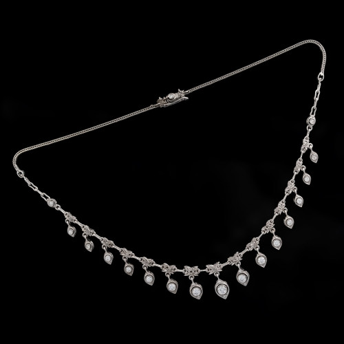 Delikatny platynowy naszyjnik zachwyca kunsztem wykonania. Diamenty w historycznym szlifie 8-cut oprawione w platynowe łezki, niektóre z nich dodatkowo ozdobione rozetami diamentowymi. Każda łezka zaprojektowana jako osobny ruchomy element mocowany na łańcuszku w fantazyjnym splocie kameryzowanym rozetami diamentowymi. Pięknie zdobione zapięcie z dwoma dodatkowymi zabezpieczeniami.