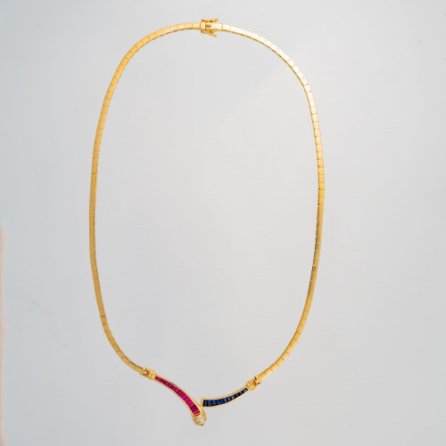 Prosty złoty naszyjnik z fantazyjnie giętym elementem kameryzowanym szafirami niebieskimi i różowymi w szlifach bagiet oraz niewielkimi diamentami a także szmaragdowym kaboszonem. Wspaniale układa się na szyi delikatnie ją otulając.