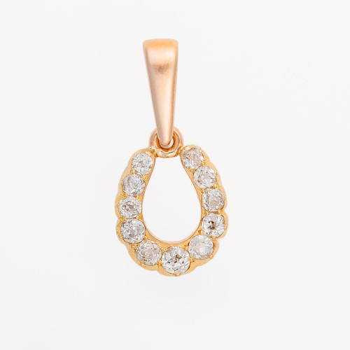 Uroczy wisior w formie podkowy będącej synonimem szczęścia. Forma zdobiona diamentami w historycznych szlifach old mine cut. Cudowny blask kamieni doskonale koresponduje z barwą ciepłego, starego złota.
