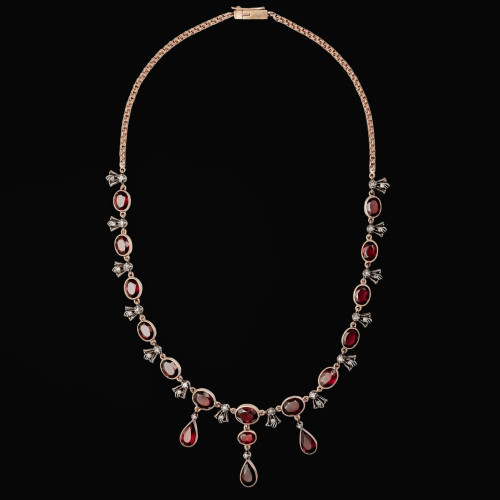 Niezwykle kobiecy naszyjnik, który zdobią płasko szlifowane, fasetowane owalne oprawione w złoto granaty. Konstrukcja przetykana wykonanymi ze srebra fantazyjnymi elementami dekorowanymi diamentami w szlifach rozet. W centralnej części umieszczono trzy szlifowane w łezki granaty zaprojektowane jako osobne ruchome elementy. Całość wieńczy złoty łańcuszek o ciekawym splocie z doskonale zabezpieczonym zapięciem.