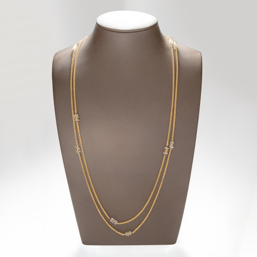 Miękko układający się naszyjnik o pięknym bogatym splocie przetykanym delikatnie połyskującymi kryształami górskimi. Elementy zdobiące wykonane z różnych pasujących do siebie form : fasetowanych kul o miodowo-brązowej barwie oraz spłaszczonych kul o przeźroczystym kryształowym połysku. Niewątpliwym atutem naszyjnika jest jego ponad półtorametrowa długość, która pozwala na dowolną stylizację wokół szyi.