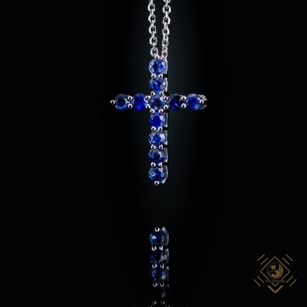 White gold cross decorated with small sapphires, hung on a chain that is delicate as a mist. This necklace is perfect as a gift for various celebrations (baptism, communion, confirmation). It is also an elegant decoration for the neckline.