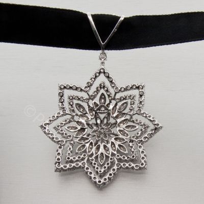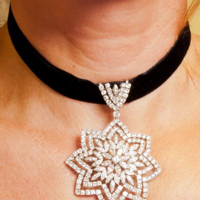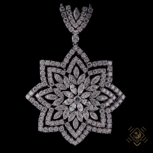 Niezwykły wisior o konstrukcji gwiazdy z wpisanym wewnątrz kwiatem. Doskonale dobrane diamenty różnych szlifów osadzone w dyskretnych oprawach. Idealna dyspersja kamieni podkreślona barwą białego złota.