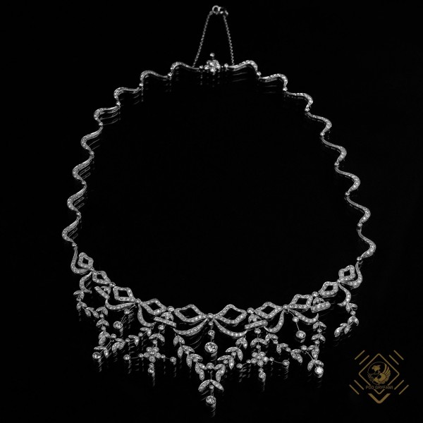 A wonderful platinum piece that displays impressive craftsmanship. The necklace contains nearly five hundred diamonds with a total weight of over 14 carats arranged into a subtle floral pattern that will make its owner's neckline a work of art.