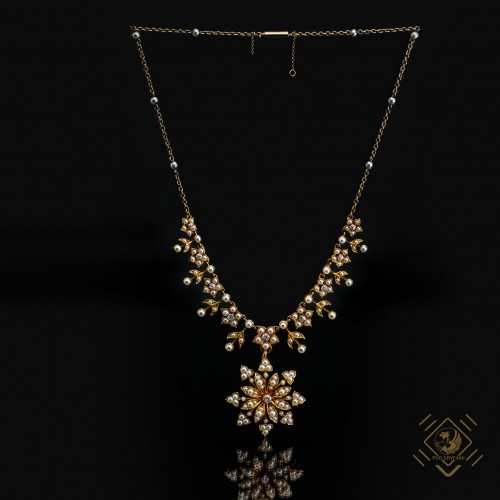 Secesyjny naszyjnik wysadzany diamentami, perłami i perłami guzikowymi. Piękny kwiatowy wzór z pewnością ozdobi niejedną szyję. Dodatkowym atutem klejnotu jest możliwość rozłożenia na dwie części. Po odpięciu głównego kwiatu otrzymamy uroczą broszkę oraz delikatny naszyjnik.