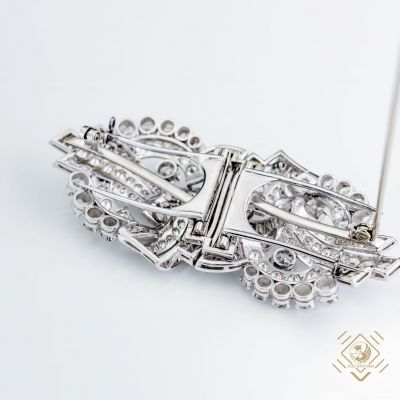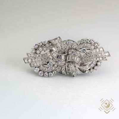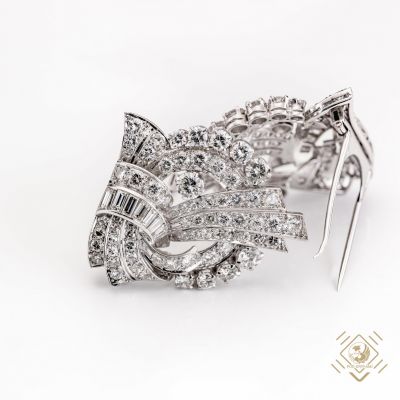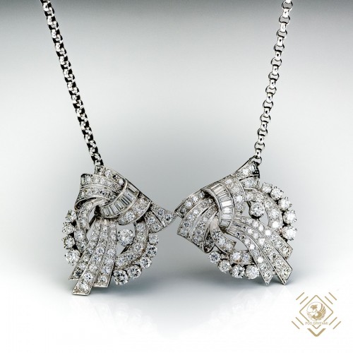 Prezentowany naszyjnik został zaprojektowany jako brosza-clip. Specjalna konstrukcja umożliwia składanie i rozkładanie broszy na dwie części, z których każdą można nosić oddzielnie oraz jako całość z łańcuszkiem w formie naszyjnika lub bez łańcuszka jako typową broszę. Klejnot został wykonany w latach 30-tych XX wieku. Przeplatające się ze sobą platynowe wstęgi ozdobione idealnie dobranymi diamentami o różnych szlifach. Całości dopełnia łańcuszek o specjalnym slocie przekładany fantazyjnymi elementami.