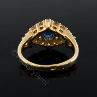 A ring sparkling with more than 20 diamonds and a centrally placed synthetic sapphire.