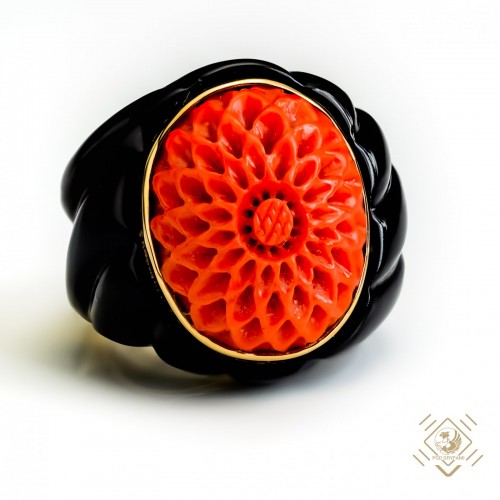 Niezwykły pierścień, którego konstrukcja została wykonana z 18 karatowego złota. Posadowiony na konstrukcji onyks szlifowany w delikatne połyskujące czernią fale podkreśla intensywną barwę wyrzeźbionej w koralu chryzantemy.