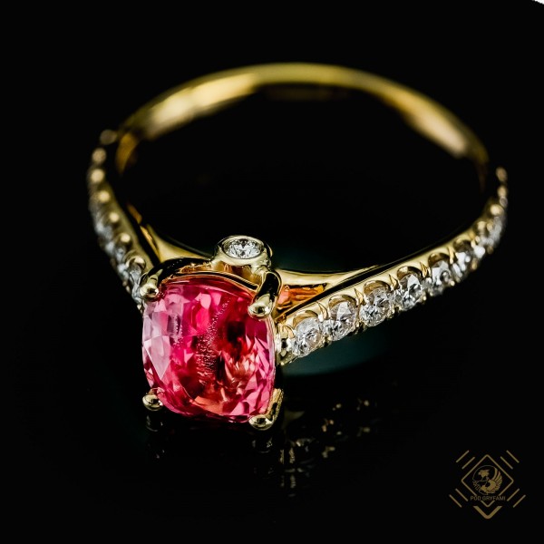 Straight set extremely rare natural pink spinelle, giving the effect of sparkling pink champagne. Due to its rarity and variety of colors, spinelle is one of the most valued colorful gemstones in jewelry. This ring originates from Vietnam from the Luc Yen district mine. The ring is decorated with perfectly proportioned small diamonds. In addition, a setting including the spinelle is decorated with two diamonds in a continuous setting. This unusual jewel is a "drop of pink champagne" among diamonds.