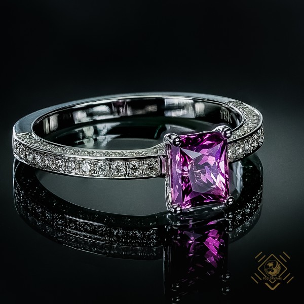 Made of 18 carat white gold, the ring is decorated with densely seated round diamonds, whose central point is a dark purple spinelle. This precious stone, highly valued in jewelry, comes from the Vietnamese deposits of the Luc Yen district. In nature, it occurs in the form of octagonal, sharp-edged crystals and owes its name to the Latin word [spine] meaning thorn, arrow. According to traditional medicine, spinelle supports the treatment of many diseases. A beautiful decoration for a woman's hand.