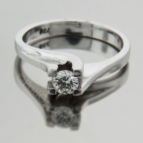 Zaręczynowa klasyka. Pojedynczy diament o szlifie brylantowym, oprawiony w białe złoto, zakuty w łapki.
