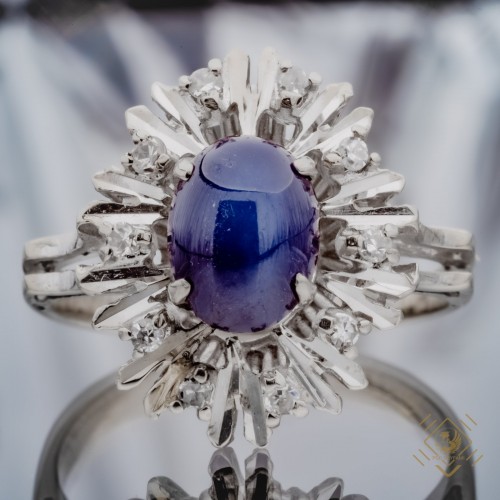 Wykonany w białym złocie pierścionek w typie koktajlowym. Szafir kaboszon osadzony centralnie w otoczeniu dziesięciu lśniących diamentów.