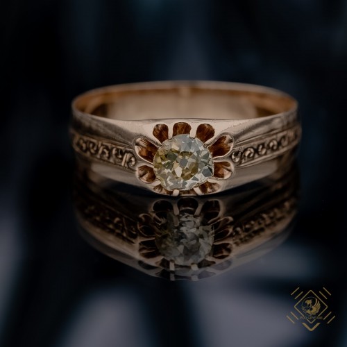 W pięknie cyzelowanej obrączce osadzony centralnie w łapkach diament o nieregularnym szlifie.