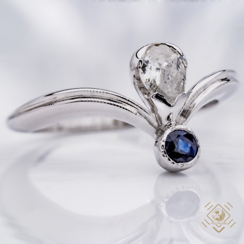 Subtelna idealnie podkreślająca kobiecość forma. Diament o szlifie gruszkowym w towarzystwie niewielkiego intensywnie granatowego szafiru.