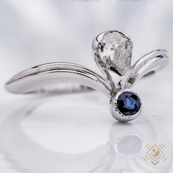 A subtle feminine form. Pear cut diamond accompanied with a small but intensely blue sapphire stone.