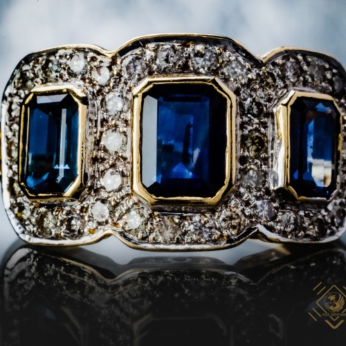 Kolejny przykład biżuterii absolutnie niepowtarzalnej i jednostkowej. Pierścień zachwyca kompozycją gdzie w oktagonalnej oprawie pysznią się trzy szafiry w otoczeniu diamentów starego szlifu europejskiego. Na szczególną uwagę zasługuje konstrukcja klejnotu z pozoru masywna w rzeczywistości lekka i finezyjna. Blask diamentów starego szlifu podkreśla urodę szafirów co w połączeniu z kunsztem wykonania doskonale oddaje klimat minionej epoki.