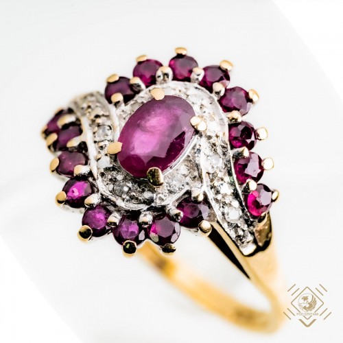 Piękna, bardzo kobieca, owalna forma pierścionka podkreślona blaskiem diamentów oraz rubinów. Osadzony w czterech łapkach, centralnie umieszczony rubin emanuje głęboką barwą ciemnego burgunda. Całości dopełniają niewielkie lśniące diamenty i drobne rubinki podkreślające fantazyjny kształt pierścienia.