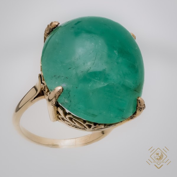 Emerald cabochon set in four clasps is the center piece of the ring. Its simple design undoubtedly adds charm to openwork fancifully shaped framing, whose golden glow perfectly compliments the bright green emerald.