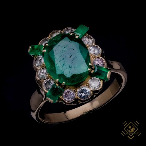 Sercem tej nietypowej markizy jest blisko dwukaratowy brazylijski szmaragd naturalny w głębokiej, nasyconej zieleni, który w otoczeniu diamentów oraz niewielkich szmaragdów w szlifach schodkowych tworzy niezwykły zielony klejnot ( z greki smaragdos ). Całości dopełnia precyzyjnie cięta ażurowa biza.