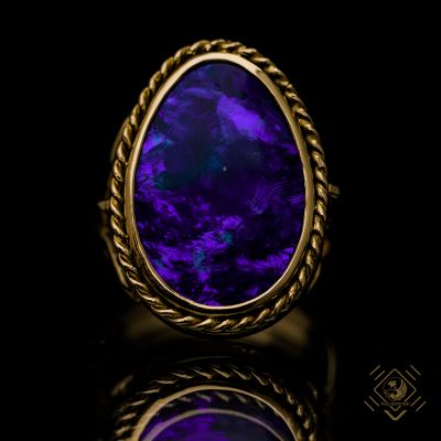 Niezwykle prosta konstrukcja pierścienia wykonana z 18 karatowego złota uzupełniona techniką fil d`ange anielskim drutem ma za zadanie podkreślić absolutną unikatowość kamienia. Wyjątkowy czarny opal stanowiący szlachetną odmianę opala o barwie podstawowej niebieskiej z efektownym zjawiskiem ognia na ciemnym tle. Klejnot zachwyca urodą kamienia,który jest oficjalnym kamieniem szlachetnym Australii. Żadne zdjęcie nie jest w stanie oddać niesamowitej opalizacji kamienia. To trzeba zobaczyć! Zapraszamy!