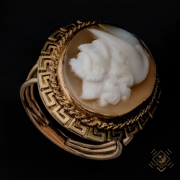 This ring is in Ancient Greek style, made of gold with meandering ornaments emphasizes the severity of the gemma representing the face of an ancient Greek warrior.