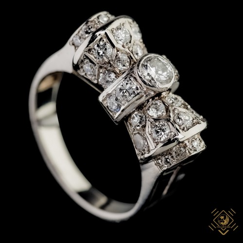 Rzadko spotykana konstrukcja pierścionka nawiązująca w swojej formie do niezwykle lekkiego sygnetu w połączeniu ze wspaniałą brylancją diamentów osadzonych w białym złocie stanowią kwintesencję stylu Art Deco. Wykonany w jednej z holenderskich pracowni złotniczych w latach 30-tych pierścień poprzez absolutnie unikatowy i niepowtarzalny design doskonale oddaje klimat epoki.