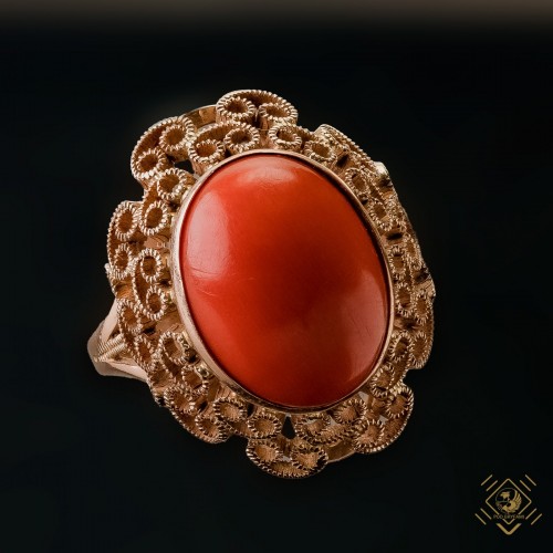 Koral szlachetny barwy czerwono jarzębinowej w owalnej formie ujęty w finezyjnie wykonaną oprawę. Wspaniała złota koronka wykonana z wielką precyzją techniką filigranu.