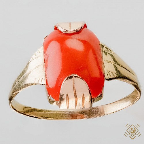 Niewielki koral szlachetny ujęty w oprawę nawiązującą swoim stylem do klasycznego stylu Art Deco.